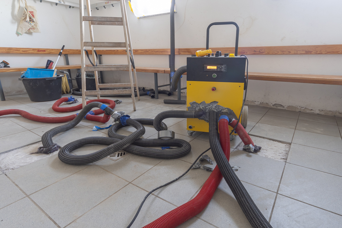 Wasserschadensanierung nach Defekt am Bodenablauf in der Umkleidekabine eines Sportheims.